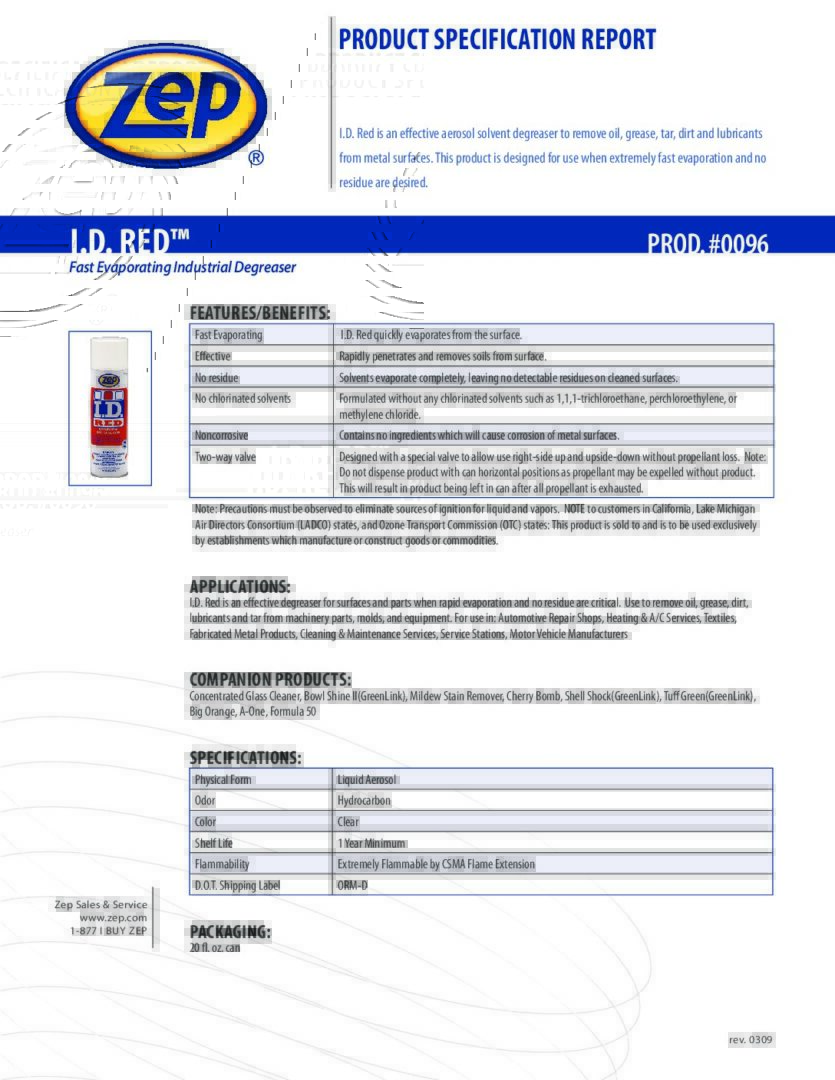 I.D. Red is an effective aerosol solvent degreaser to remove oil, grease, tar, dirt and lubricants from metal surfaces. This product is designed for use…