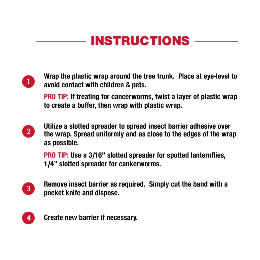 Save your trees – our specially-formulated Insect Barrier Adhesive can be combined with standard plastic wrap to create a tree band. Tree bands are effective at controlling and monitoring invasive pests like the spotted lanternfly, cankerworms, gypsy moths, winter moths, black vine weevils, ants, caterpillars and stink bugs. The tree band creates a physical barrier that traps the insects as they attempt to feed on your trees. Our adhesive formula includes a UV inhibitor to resist the affects of the sun and weather. This allows the adhesive to last all season long. The soft formula minimizes impact on non-targeted species. Like all of our adhesive products, the Insect Barrier Adhesive is non-toxic and safe to use around children and pets.