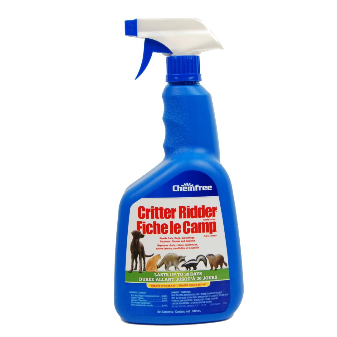 Chemfree Critter Ridder Ready-To-Use Animal Repellent is an effective dual-action spray that uses ingredients such as dried blood, putrescent egg, and garlic to create an unpleasant environment. It repels by irritating the animal’s sense of smell and taste so they seek food and shelter elsewhere. For your convenience, Critter Ridder is also easy to use. Simply point the bottle in the designated area, and spray! The formula repels cats, dogs, skunks, and more. The 940 mL bottle covers up to 29.7 m² for up to 30 days, leaving more time for you to enjoy the comfort of your outdoor space.
