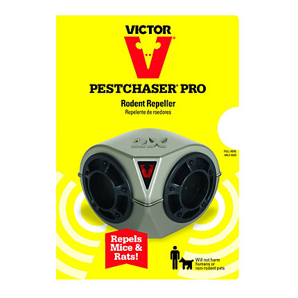 The Victor PestChaser Pro Rodent Repeller emits ultrasonic frequencies that send mice and rats scurrying. The device uses varying frequencies to prevent rodents from getting used to the noise and to keep them from returning. With more than 2 times the power output of standard ultrasonic pest control units, this PestChaser is ideal for use in large rooms such as attics, basements, garages, and warehouses. The 6 ft power cord allows for flexible placement. The device uses varying frequencies to prevent rodents from getting used to the noise and to keep them from returning. Once plugged in, a red LED light lets you know the unit is working. While the Victor PestChaser Pro Rodent Repeller is unpleasant to rodents, its high-frequency sound is safe for use around people and non-rodent pets when used as directed. Note: Ultrasonic sound cannot penetrate furniture, cabinets, or walls. Multiple units required for multiple rooms. Rodents that are hungry or tempted by easily accessible food may find another route around your protected area, so it is best to remove all likely food sources prior to use. PestChaser works best to repel rodent populations when used with other rodent control methods as part of an integrated approach to trap, repel, and monitor infestations.