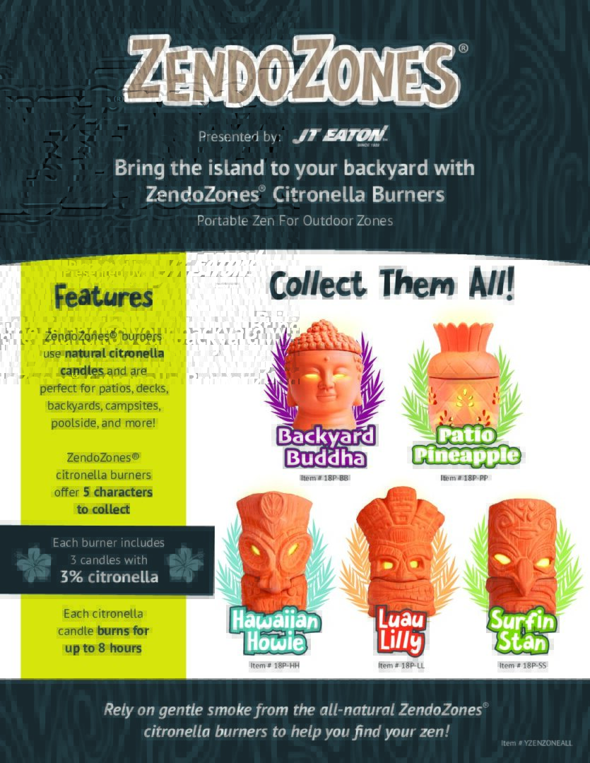 Bring the island to your backyard with Zendo Zones Citronella burners. This portable candle burner is perfect for patios, decks, backyards, campsites, poolside and more. The gentle smoke from all-natural Zendo Zones will help you find your Zen anytime and anywhere. This 3-pack comes with 9 total Citronella Candles with 3% Citronella and all 3 burners in the Zendo Zones collection: Hawaiian Howie, Luau Lilly and Surfing Stan. JT Eaton’s mission is to manufacture and distribute products designed to eradicate pests. We continually seek out new ways to provide consumers with the knowledge and products they need to create a healthier and safer world. JT Eaton has been family owned and operated since 1932 and all their products are made with quality.